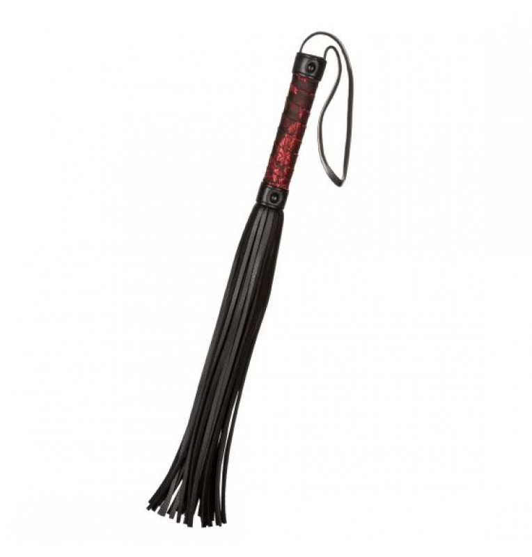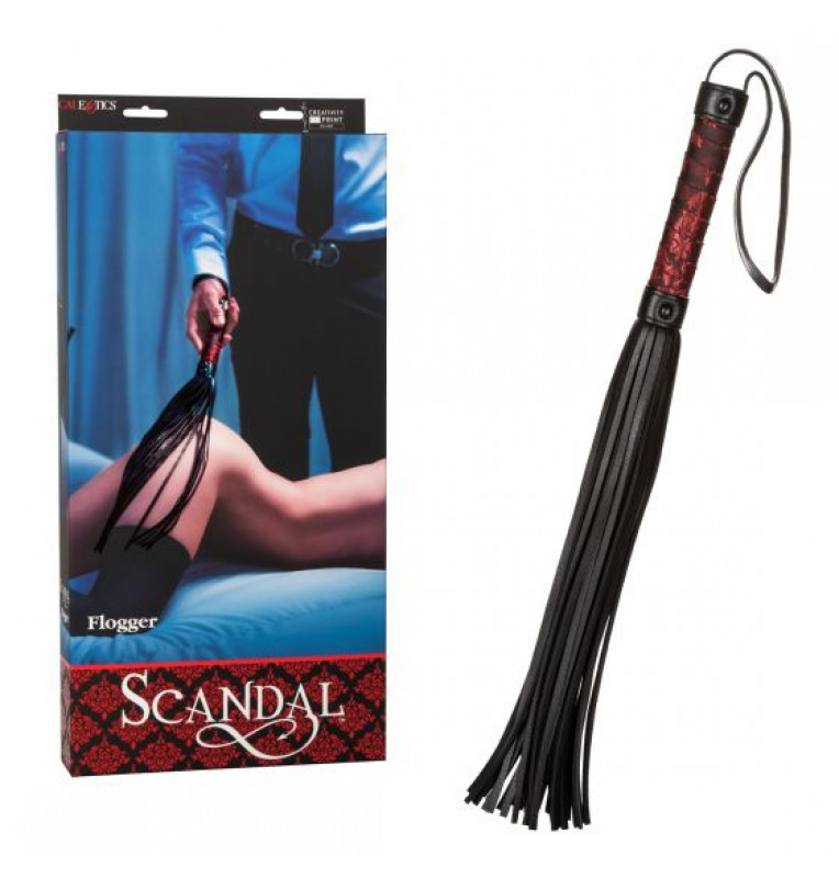 Многохвостая гладкая плеть (флогер) Scandal Flogger Bulk – универсальный ударный девайс для эротических ролевых игр и практик БДСМ. Флогер относится к мягкому типу. Он состоит из прочной рукояти, оформленной роскошной дизайнерской тканью в черно-красных тонах, удобной черной кожаной петли для фиксации изделия на запястье (темляк) и множества хвостов, нарезанных из тонких полос, соединенных между собой черными металлическими заклепками. Длина хвостов - 37,5 см.