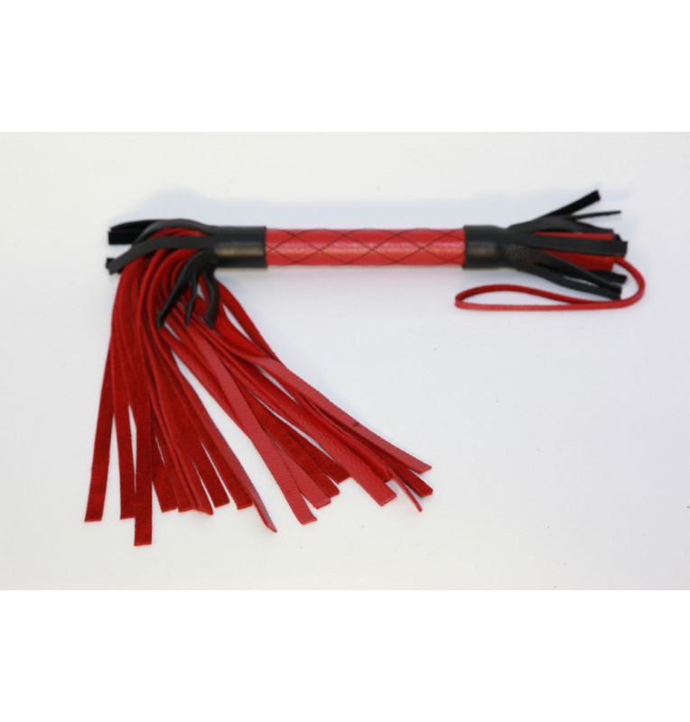 Аккуратная черно-красная плетка, изготовленная из натуральной кожи. Имеет жесткую ручку, также покрытую кожей. Имеется петля для удобного использования плети. Длина хлыстов - 27 см.
