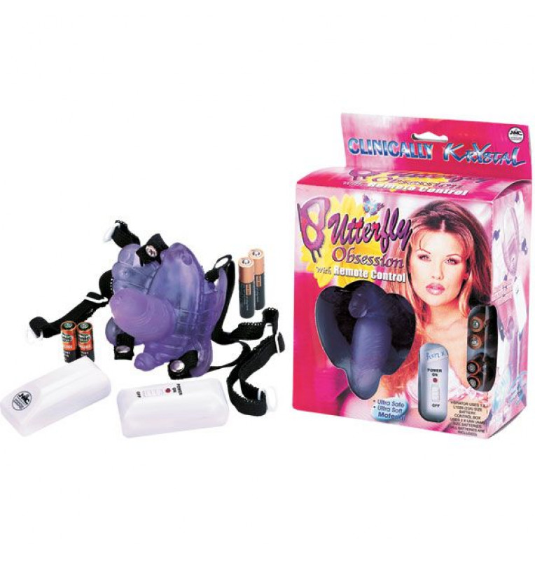 Клиторальный вибростимулятор на эластичных ремешках BUTTERFLY OBSESSION. Вибромассажер в виде бабочки с фаллоимитатором. Крепится к телу эластичными, регулируемыми ремешками. Мощный мини-электромотор с дистанционным пультом управления. Длина фаллоса - 5 см., диаметр - 2 см.