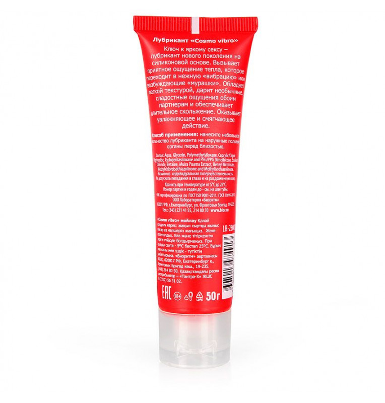 Ключ к яркому сексу - стимулирующий лубрикант нового поколения на силиконовой основе Cosmo vibro. Это больше, чем просто лубрикант! Активный компонент в составе - экстракт муира-пуамы - оказывает необычное стимулирующее действие, вызывая нежную «вибрацию» и возбуждающие «мурашки». Обладает легкой текстурой, дарит необычные сладостные ощущения обоим партнерам и обеспечивает длительное скольжение. Оказывает увлажняющее и смягчающее действие. Совместим с изделиями из латекса и полимерных материалов.