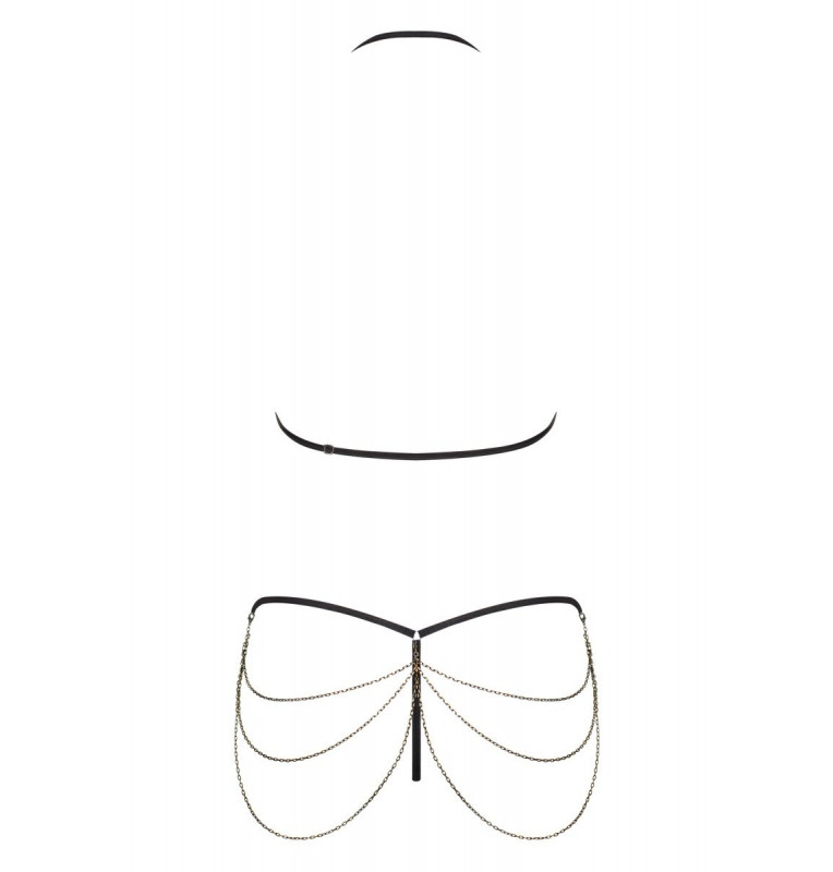 Откровенный комплект белья Redella состоит из лифа и трусиков-стрингов. Комплект выполнен из эластичной эко-кожи. Лиф мягкий без косточек, бретель фиксируется за шеей. Комплект декорирован тонкими цепочками. В комплекте: лиф, трусики-стринги.