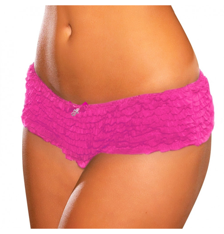 Трусики-шортики розового цвета расшиты многослойными рюшами. Трусики открывают гениталии, чтобы можно было заниматься сексом прямо в них. Декорированы бантиком.