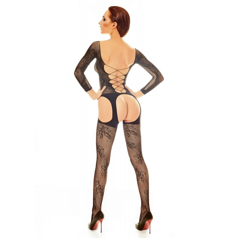 Соблазнительный комбинезон с имитацией чулок и длинными рукавами, выполнен из эластичного и приятного на ощупь материала с цветочным рисунком.