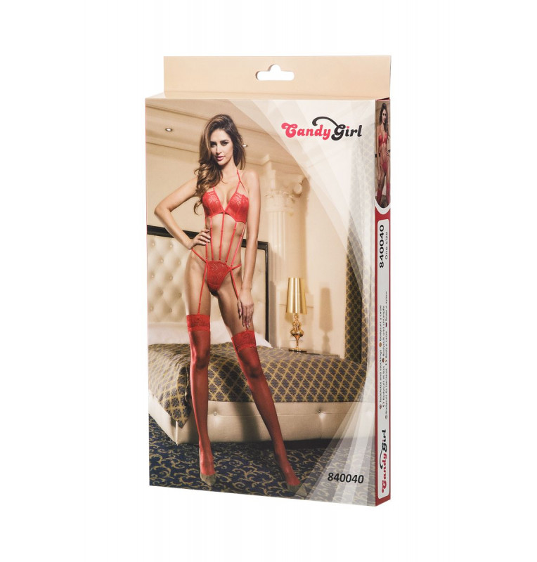 Боди с вставками из эластичного кружева и регулируемыми продольными перемычкам и пажами завязывается на уровне шеи и груди. Прозрачные чулки с кружевной резинкой в комплекте. В комплекте: боди, чулки.
