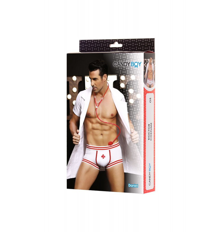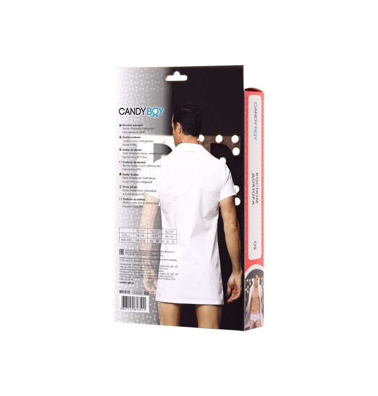 Плотный непрозрачный халат с отложным воротником, накладными карманами, короткими рукавами, контрастной отделкой и значком-бейджем, куда легко вписать имя. Слегка приталенный силуэт халата добавит стройности фигуре. Эластичные боксеры с контрастной отделкой, на широких резинках. В комплекте: халат, трусы-боксеры, стетоскоп и значок.