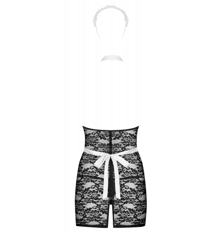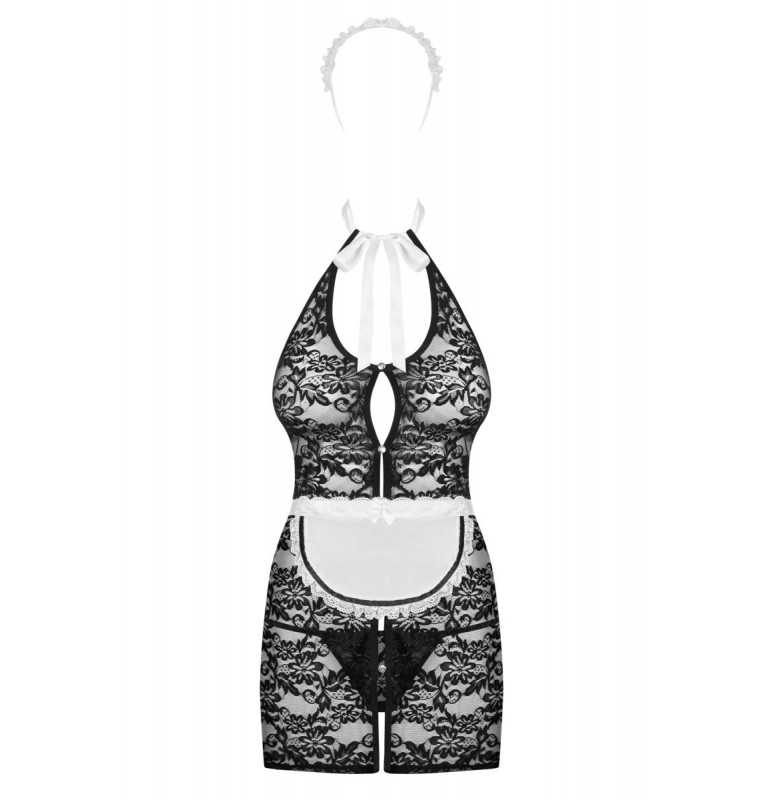 Костюм горничной для ролевых игр из четырех предметов. Короткое платье изготовлено из кружева с цветочных мотивом. Спереди украшено пикантными вырезами и декоративными пуговицами. Платье завязывается бантом на шее с помощью белых атласных лент, обнажая спину. Фартук, декорированный оборками и бантиком также завязывается на ленты. Ободок на голову с нежной оборкой дополняет образ. В комплекте: платье, фартук, ободок, трусики-стринги.