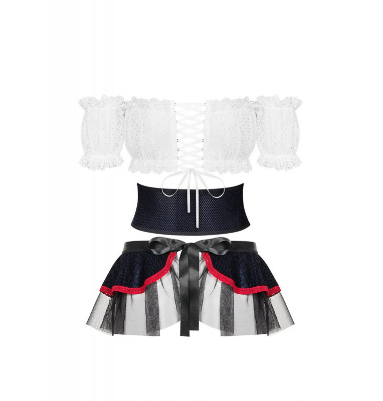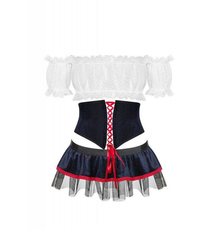 Соблазнительный костюм славянки состоит из пяти частей. Полупрозрачный топ-бюстгальтер с принтом в мелкий горошек, на спинке очаровательная шнуровка. Два коротких рукава, которые не соединены с топом. Широкий пояс с красной шнуровкой. Короткая юбка с рюшами очень кокетливо ниспадает на бедра, сзади завязывается на атласные ленты. В комплекте: топ-бюстгальтер, 2 рукава, пояс, юбка, трусики-стринги.