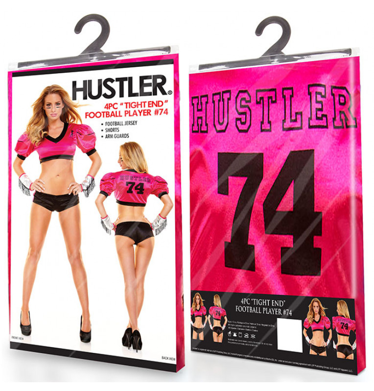 Яркий и оригинальный наряд сексуально-спортивного стиля из короткого топа, шортиков и нарукавников. Данный комплект позволит создать образ страстной любительницы американского футбола. Яркий розовый топ с характерными плечиками имеет принт с номером 74 и надписью HUSTLER на спине, а также оригинальный логотип бренда спереди. В комплекте: топ, шорты, нарукавники.
