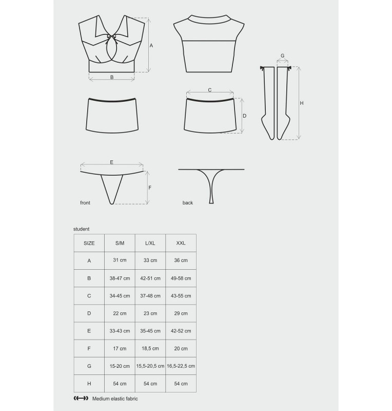 Ну, что – поиграем? Примерьте на себя озорной и провокационный костюм студентки-нимфетки и предложите своему мужчине роль строгого учителя. Только не увлекайтесь решением задачек и написанием диктантов: в жизни, и тем более в спальне, есть вещи и поинтереснее. Соблазнительная форма студентки состоит из белого топа с глубокой линией декольте, мини-юбки насыщенного розового цвета, трусиков и белых гольф, украшенных атласными бантиками. В комплекте: топ, юбка, трусики-стринги, гольфы.