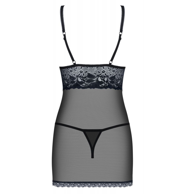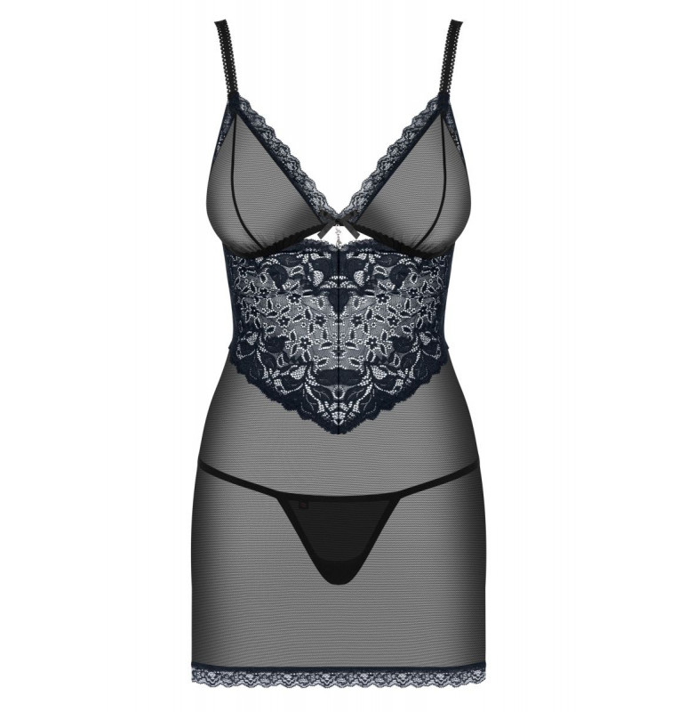 Прозрачная сорочка. Под грудью сорочка декорирована вставкой из темно-синего кружева, бретели регулируются. В комплекте: сорочка и трусики-стринги.