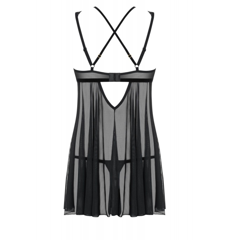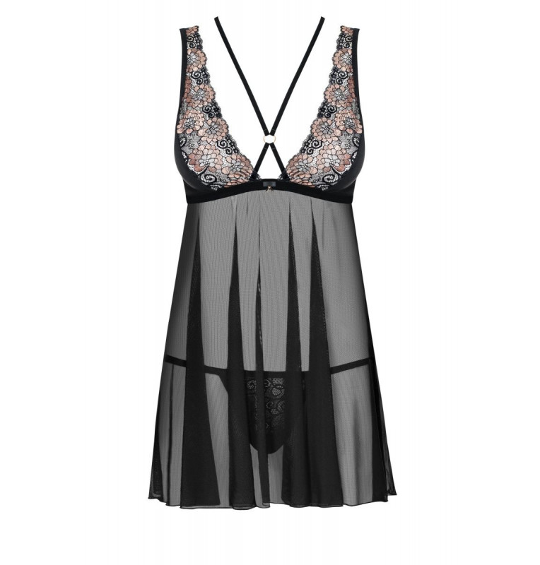 Обольстительная сорочка выполнена из полупрозрачной сеточки. Лиф сорочки украшен цветочным кружевом и бархатными лентами. Бретели регулируются по длине, на спинке застежка. В комплекте: сорочка и трусики-стринги.