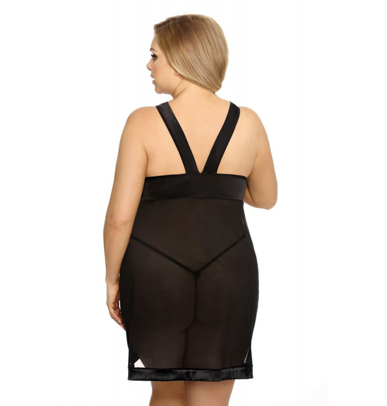 Прозрачная коротенькая сорочка с V-образным вырезом. В комплекте: сорочка, трусики-стринги.
