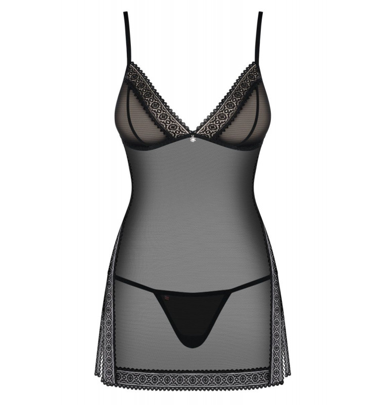 Полупрозрачная сорочка. Сорочка с мягкой чашкой и разрезами по бокам, бретели регулируются по длине.В комплекте кружевные стринги. В комплекте: сорочка, трусики-стринги.