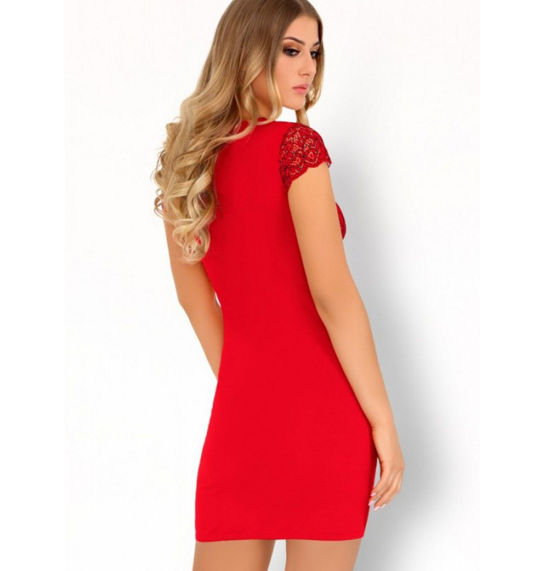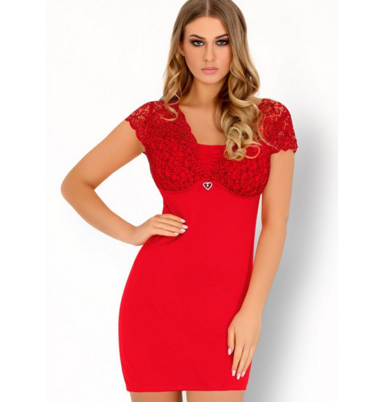 Короткая ночная сорочка облегающего покроя. Мягкие чашечки сорочки украшены узорчатым кружевом. В центре сверкающее украшение в форме сердечка. Короткие рукава также декорированы кружевом. Низ и спинка изделия изготовлены из гладкой однотонной ткани. В комплекте: сорочка и трусики-стринги.
