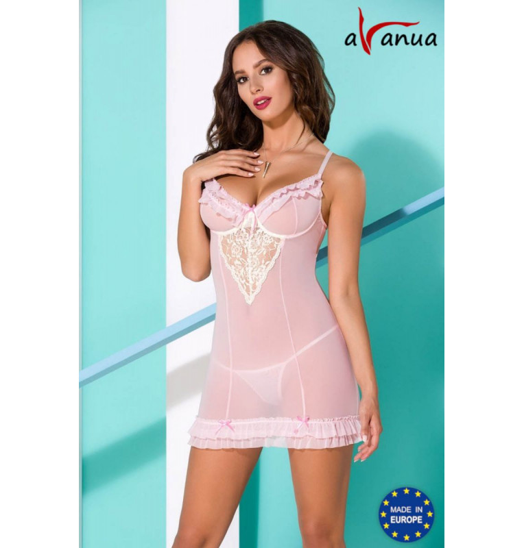 Полупрозрачная сорочка Sisi. Чашечки мягкие на косточках, бретели регулируются. Сорочка декорирована красивым кружевом и рюшами. В комплекте: сорочка и трусики-стринги.
