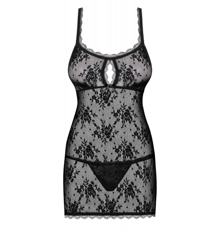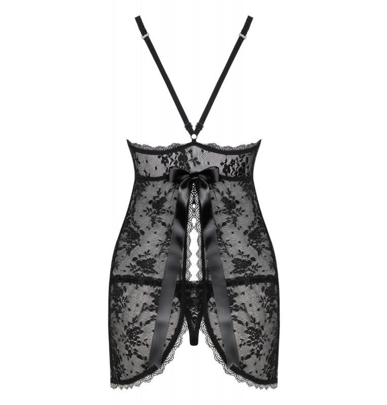 Соблазнительная сорочка Behindy выполнена из эластичного кружева. Отрезной мягкий лиф без косточек украшен каплевидным вырезом, бретельки регулируются. Сорочка слегка расклешенного кроя, сзади пикантный разрез с атласным бантиком. В комплекте: сорочка и трусики-стринги.