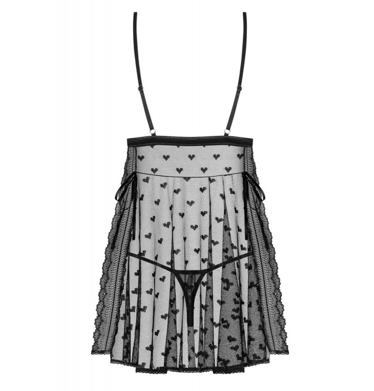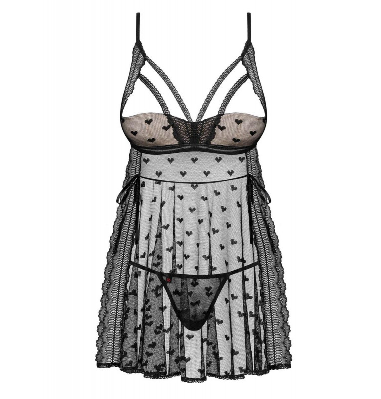 Легкомысленная коротенькая сорочка. Выполнена из тонкого тюля с узором в сердечки. Получашечки на бежевом подкладе подчеркивают грудь. Декоративные тесемки в два ряда и кружево привлекают внимание к зоне декольте. Тонкие бретели с металлической фурнитурой регулируются по длине, обнажая спину. Полупрозрачный ниспадающий подол дополнен игривыми разрезами по бокам. Их украшаю банты из атласных лент. Трусики-стринги включены в комплект. В комплекте: сорочка, трусики-стринги.