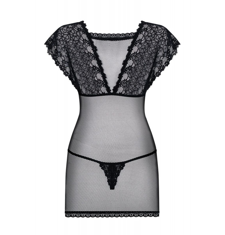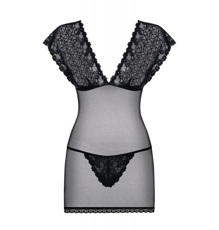 Оригинальная сорочка из сетки и кружев. плотно облегает стан, подчеркивая изгибы. Длина мини. В комплекте: сорочка, трусики-стринги.