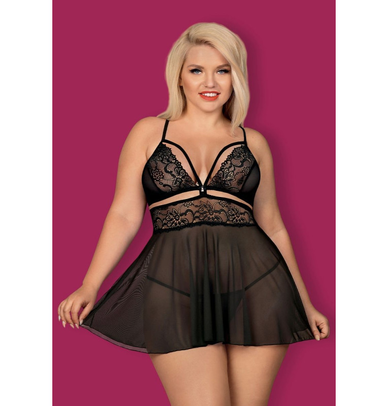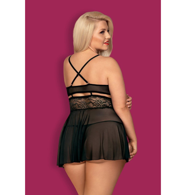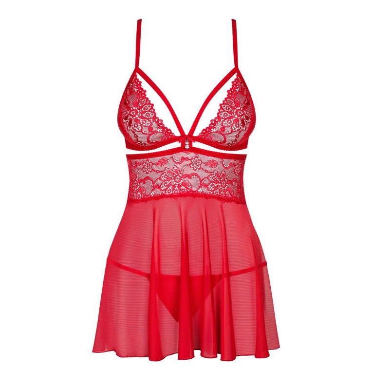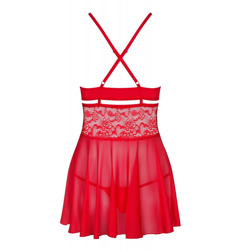 Полупрозрачный бэби-долл с расклешенным силуэтом. С открытой спиной, бретели регулируются по длине, крест на крест. Зона декольте украшен кружевом и кулончиком. В комплекте: сорочка, трусики-стринги.