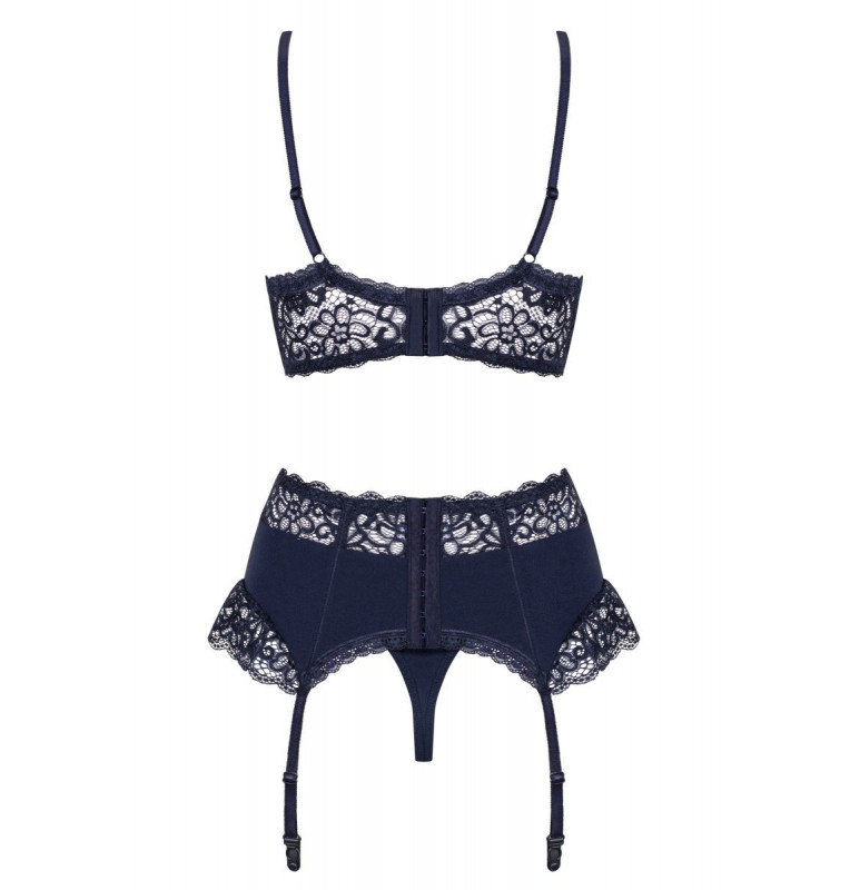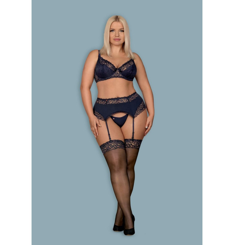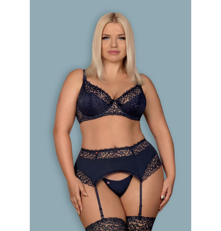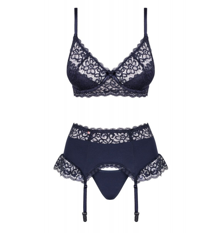 Стильный комплект женского белья. Бюстгальтер на косточках и поролоне с подкладкой прекрасно подходит для пышной груди. Спереди бра украшен атласным бантиком. Сзади застежка на три ряда крючков для наилучшего прилегания. Бретели регулируются по длине. Широкий пояс с высокой посадкой также расшит кружевом и оборками. Сзади застежка на крючки. Пажи регулируются по длине. В комплекте: бюстгальтер, трусики-стринги, пояс для чулок.