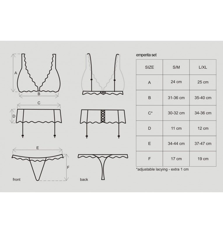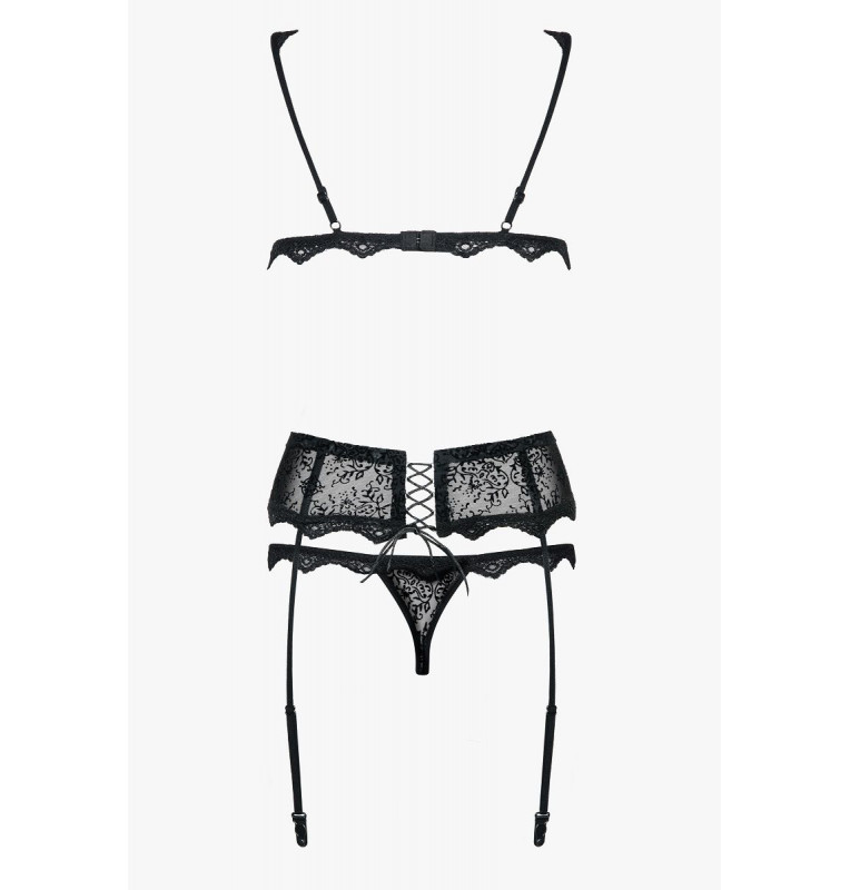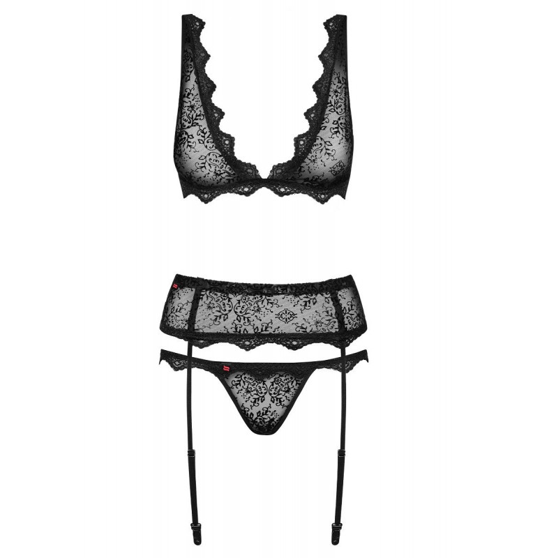 Сексуальный и элегантный комплект – идеально для вечера вдвоем! В комплекте три предмета: соблазнительный бюстгальтер, пикантный пояс для чулок и стринги. Все элементы комплекта украшены со вкусом узорами с цветочным мотивом и кружевной отделкой! Мягкий бюстгальтер с регулируемыми бретелями. Резинка под грудью и тройная застежка на крючки гарантирует комфорт и идеальную подгонку! Прозрачные чашки бюстгальтера декорированы орнаментами из велюра и кружевом. Широкий пояс для чулок с косточками, регулируемыми резинками и корсетной шнуровкой. Стринги с цветочным узором из велюра и кружевом. В комплекте: лиф, трусики-стринги, пояс для чулок.