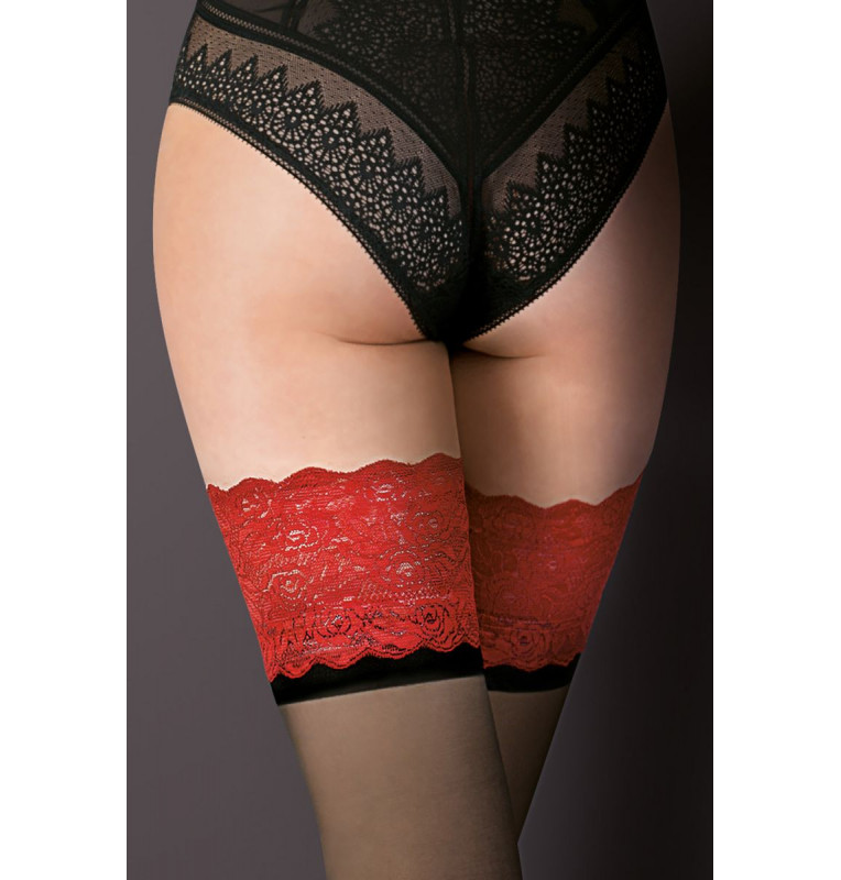 Чулки Victoria с ажурной резинкой на силиконе и матовой полосой под ней. Цвет красный с черным: красная резинка, чёрная матовая полоска, чёрный чулок. Цвет черный с красным: черная резинка, красная матовая полоска, черный чулок.