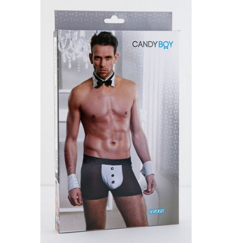 Костюм джентльмена из 4 предметов: трусы-шорты на эластичной резинке, воротник-галстук на застежке-липучке, манжеты на кнопке. В комплекте: шорты, воротник, манжеты.