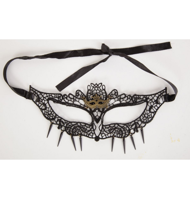 Кружевная маска в венецианском стиле с многочисленными узорами. С бронзовой масочкой по центру и шипиками в виде дополнительного украшения. Завязывается на атласные ленты. Упаковка - картонный конверт. Размеры - 22 х 8,5 см.