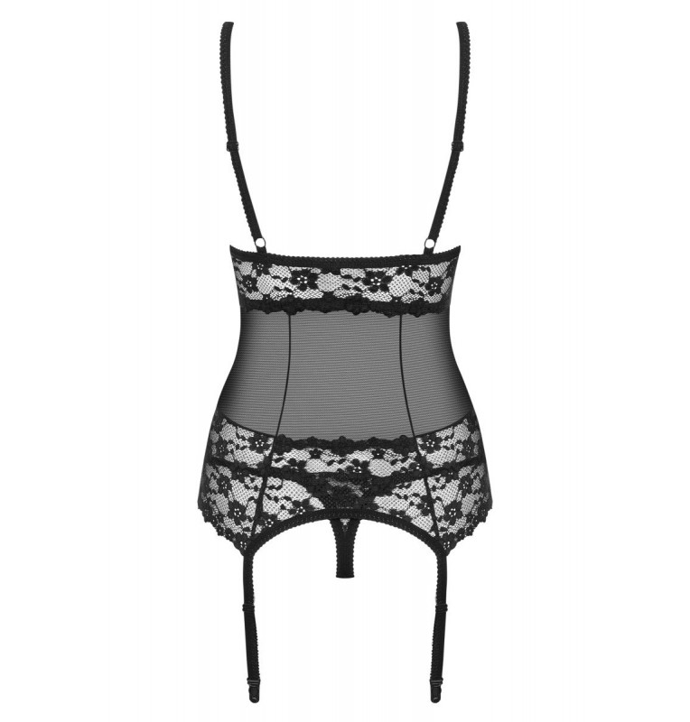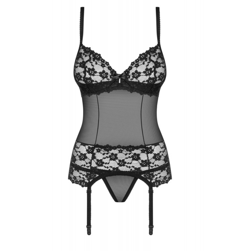 Элегантный корсаж, изготовленный из прозрачной вуали и узорчатого кружева. Чашечки корсажа на косточках с тонким поролоном снизу визуально делают грудь пышнее. Декоративный бантик и сверкающая подвеска привлекают внимание к зоне декольте. Бретели регулируются по длине. Низ корсажа также выполнен из кружева. Пажи позволяют дополнить корсаж чулочками. В комплекте: корсаж и трусики-стринги.