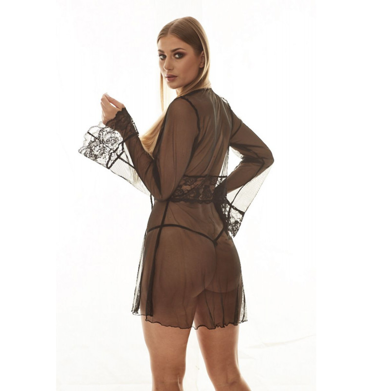 Шикарный пеньюар из прозрачного тюля Maxine на завязках украшен кружевными вставками на талии и на манжетах. Трусики не входят в комплект!