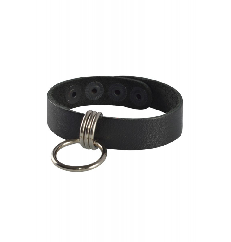 Браслет из натуральной кожи, украшен подвесным металлическим кольцом. Регулируется при помощи кнопок. Металлическое кольцо имеет никелевое покрытие. Ширина - 1,5 см.