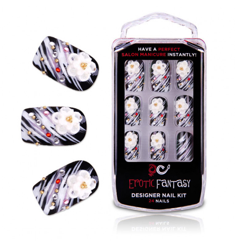 Стильный маникюр - отличное дополнение к любому образу! Набор из 24 акриловыз типсов с нанесенным черным лаком с белыми полосками. Восемь ногтей украшены объемными цветами и яркими стразами. В наборе несколько размеров ногтей, что позволит найти наиболее подходящие по форме к твоим собственным ногтям.