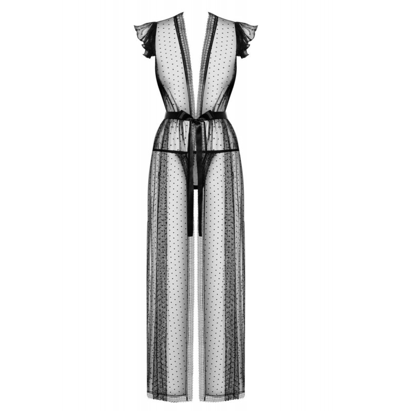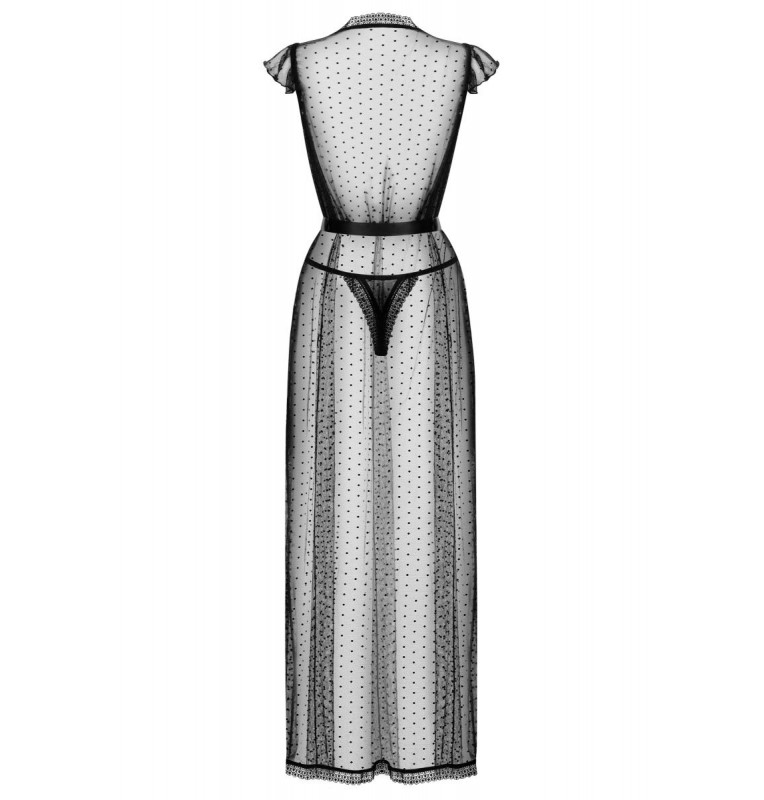 Полупрозрачный длинный пеньюар и стринги в мелкий горошек с отделкой из кружева. В комплекте: пеньюар и трусики-стринги.