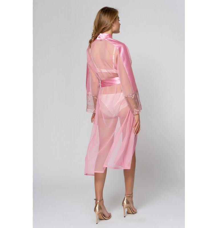 Легкий халатик выполнен из полиэстера высокого качества. Халат на запахе, свободного кроя для комфортной носки. Свободные длинные рукава декорированы микросеткой с оригинальной вышивкой. Края полочек и съемный пояс выполнены из атласной ткани. Лёгкий халат классического цвета настроит не только на отдых, но и более яркое продолжение дня.