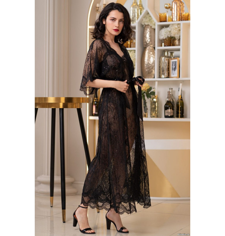 Длинный пеньюар с широким рукавом, выполнен из французского кружевного полотна с нашитыми пайетками в цвет кружева. Фестон кружева расположен по краям бортов, низу рукавов и низу изделия. Линия талии регулируется за счет атласного пояса, концы которого декорированы кружевом.