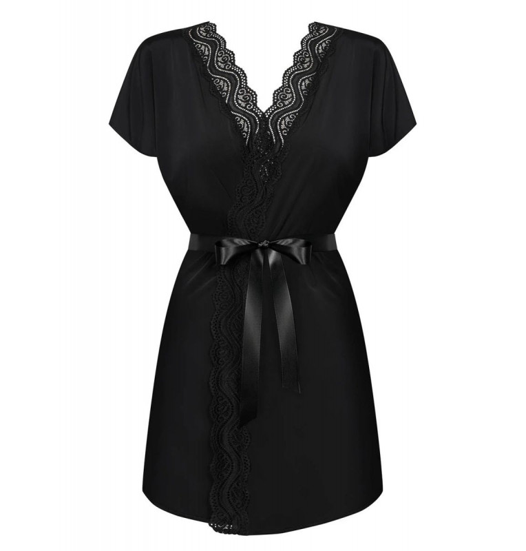 Короткий пеньюар из эластичной облегающей ткани. Украшен узорчатым кружевом по краю и на боках. Пеньюар завязывается на талии при помощи глянцевого атласного пояса. Кокетливый сатиновый бантик на спинке добавляет модели изюминку.