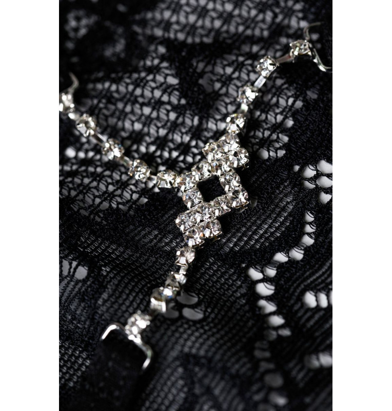 Невесомое и полупрозрачное кружево с цветочным орнаментом спереди. Изящная и легкая деталь, выполненная из блестящих страз придает сексуальному образу роскошной элегантности.