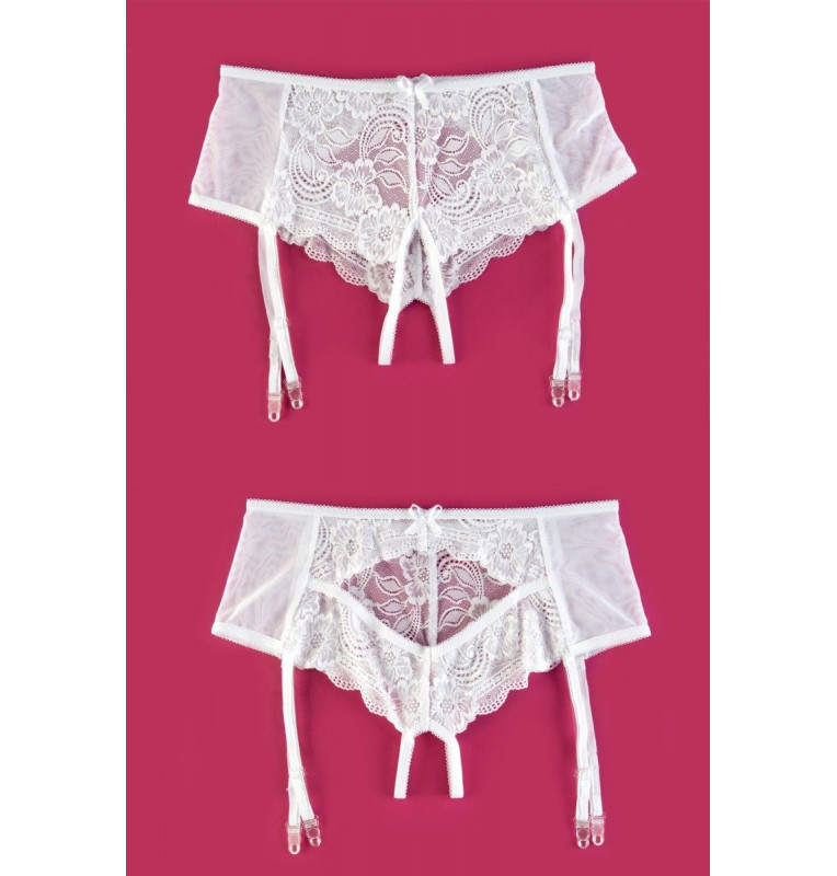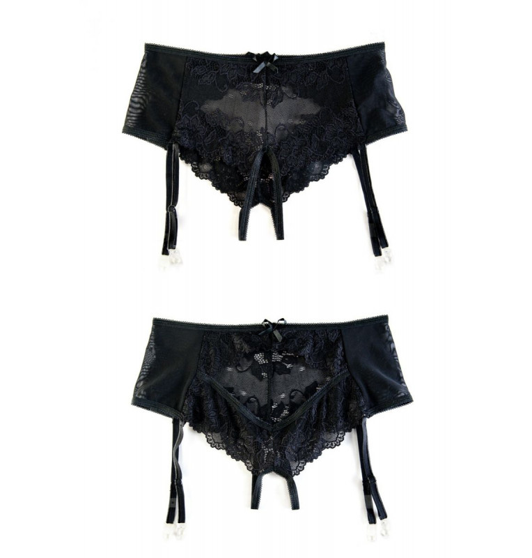 Эротические эластичные трусики-пояс из стрейч-сетки со сложными кружевными вставками, с вырезом сзади, без боковых швов, с атласными бантиками. Пажи съемные.