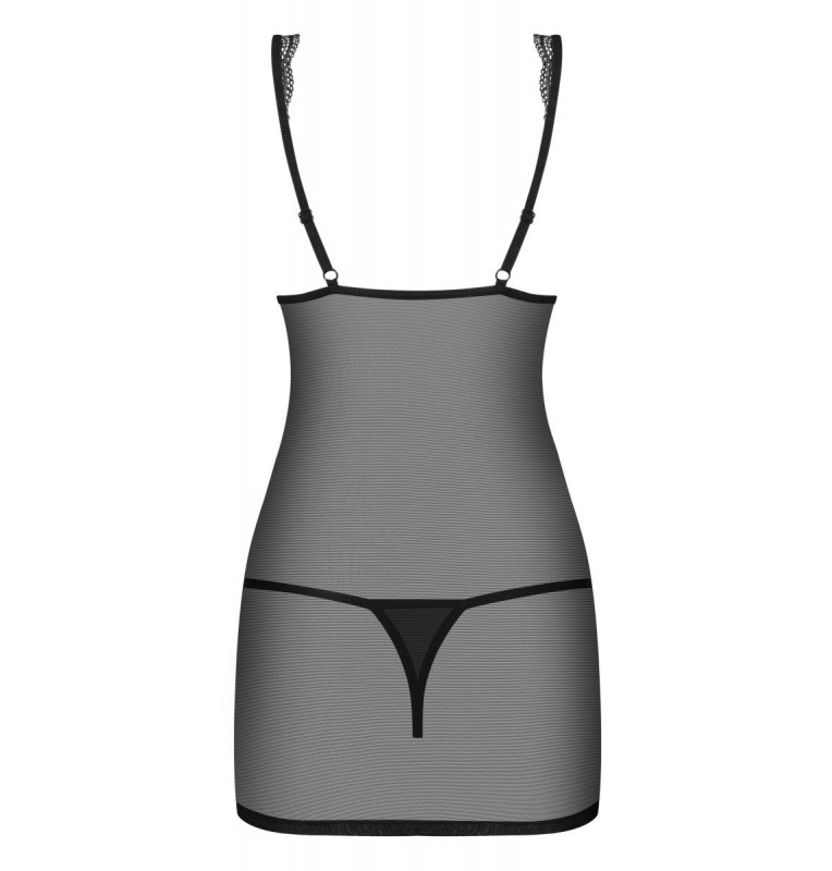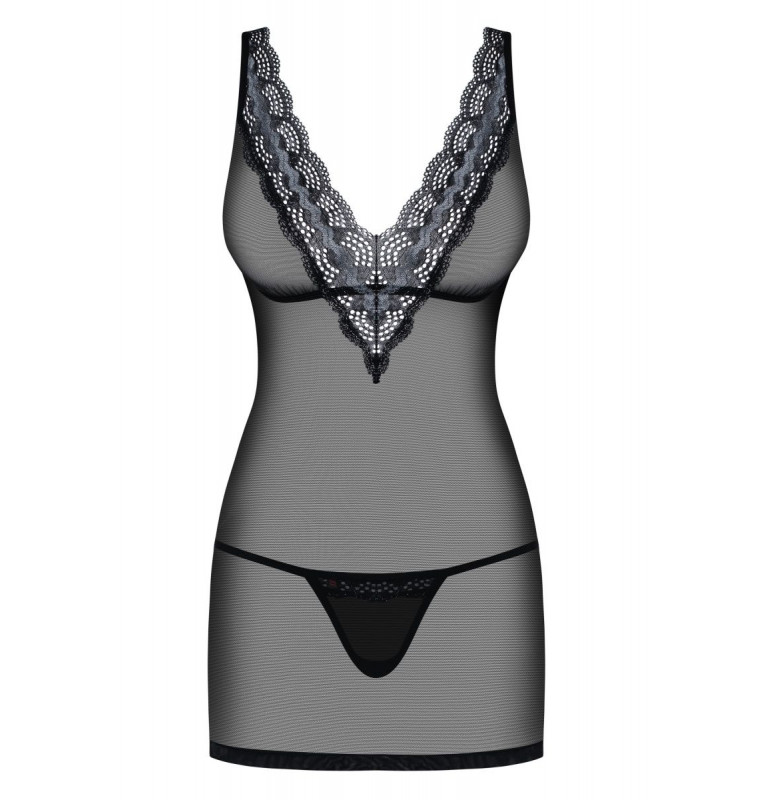 Полупрозрачная короткая сорочка с V-образным вырезом сорочки. Декорирована кружевом, бретели регулируются. В комплекте: сорочка и трусики-стринги.