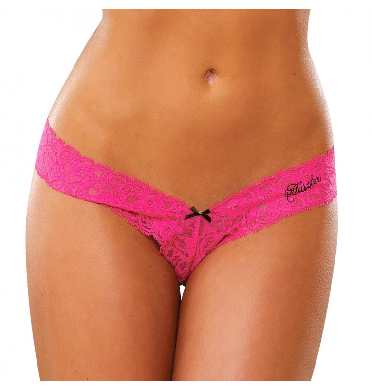 Розовые трусики из ажурной материи с низкой талией. Абсолютное незаметны под одеждой. Украшены бантиком спереди и надписью HUSTLER на левом бедре.