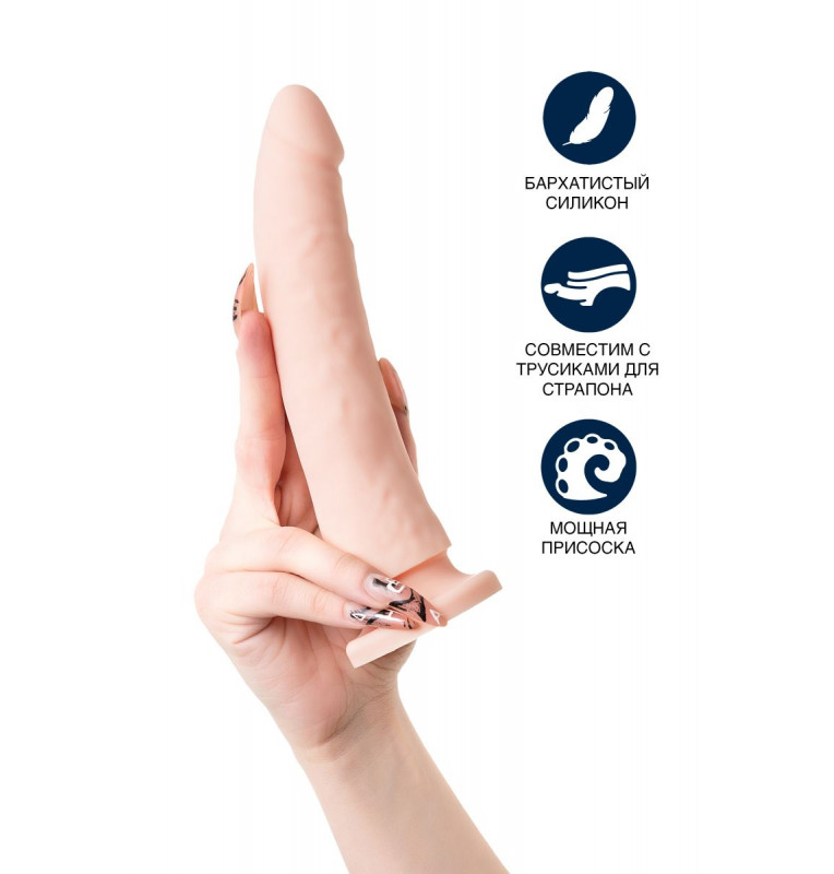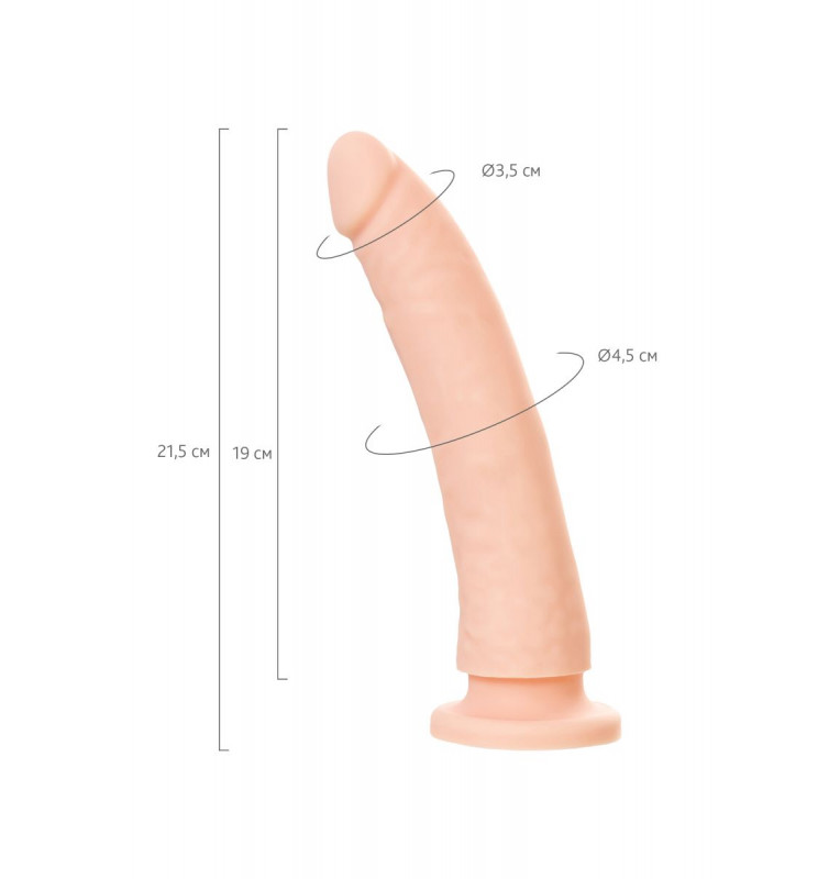 Классический фаллоимитатор Realstick Elite Silicone сочетает в себе уникальность ощущений и невероятную реалистичность. Гибкий ствол и мягкий бархатистый силикон делают проникновение нежным и комфортным. Гладкая нежная головка и рельефные вены обеспечивают дополнительную стимуляцию. В основании мощная присоска, которая позволяет крепить изделие на любой гладкой поверхности. Отлично подходит для использования с трусиками RealStick Strap-On. Дерзкий и стильный фаллоимитатор Realstick Elite Silicone подходит для тех, кто не готов идти на компромиссы и хочет для себя самого лучшего любовника. Общая длина: 21,5 см Рабочая длина: 19 см Диаметр: 3,5-4,5 см Рабочая длина - 19 см. Минимальный диаметр - 3,5 см.