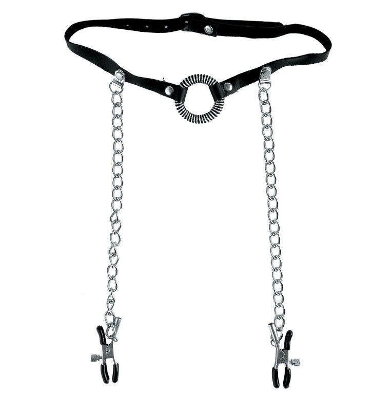 Кольцо-расширитель для рта с цепочками, соединяющими его с клипсами для сосков O-Ring Gag Nipple Clamps