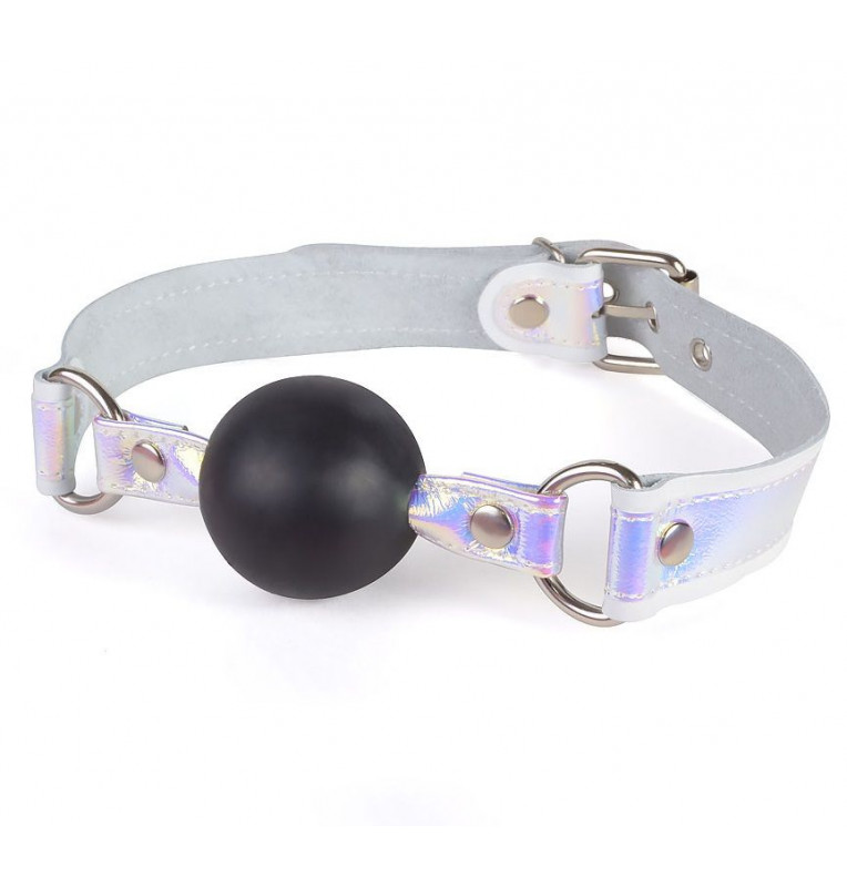 Кляп-шарик – приспособление для лишения партнёра возможности издавать громкие звуки и произносить членораздельные слова. Гаг состоит из цельного черного шара из современного материала ТЭП и ремня для фиксации из плотной натуральной кожи белого цвета с перламутровой вставкой и металлическими заклёпками с никелевым покрытием. Особенностью материала является то, что помимо белого и голубого он способен принимать розовые, желтые и другие оттенки. Ширина ремешков - 2,5 см. Диаметр шара - 4,5 см.