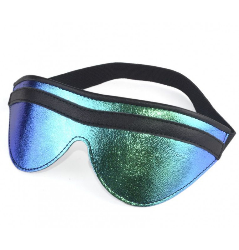 Маска на глаза закрытого типа из натуральной кожи и голографического материала цвета хамелеон с черной контрастной отделкой является атрибутом для эротических ролевых игр и практик БДСМ. Особенностью материала является то, что помимо синего, бирюзового и салатового, он способен принимать множество промежуточных оттенков. Фиксирующая резинка позволяет легко регулировать размер изделия. Внутренняя часть имеет подкладку из велюровой бархатистой кожи. Ширина - 7 см.
