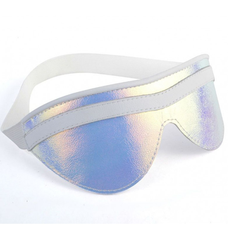 Маска на глаза закрытого типа из натуральной кожи и голографического материала перламутрового цвета с белой отделкой. Особенностью материала является, то, помимо белого и голубого, он способен принимать розовые, желтые и другие оттенки. Фиксирующая резинка позволяет легко регулировать размер изделия. Внутренняя часть имеет подкладку из велюровой бархатистой кожи. Ширина - 7 см.