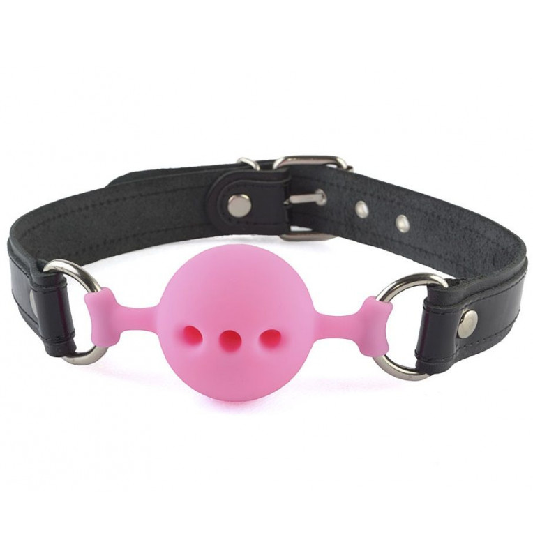 Кляп с оригинальным кожаным ремешком и лаковыми вставками черного цвета. Сам кляп-шар изготовлен из силикона в розовом исполнении, приятного на ощупь, со специальными отверстиями, пропускающими воздух.