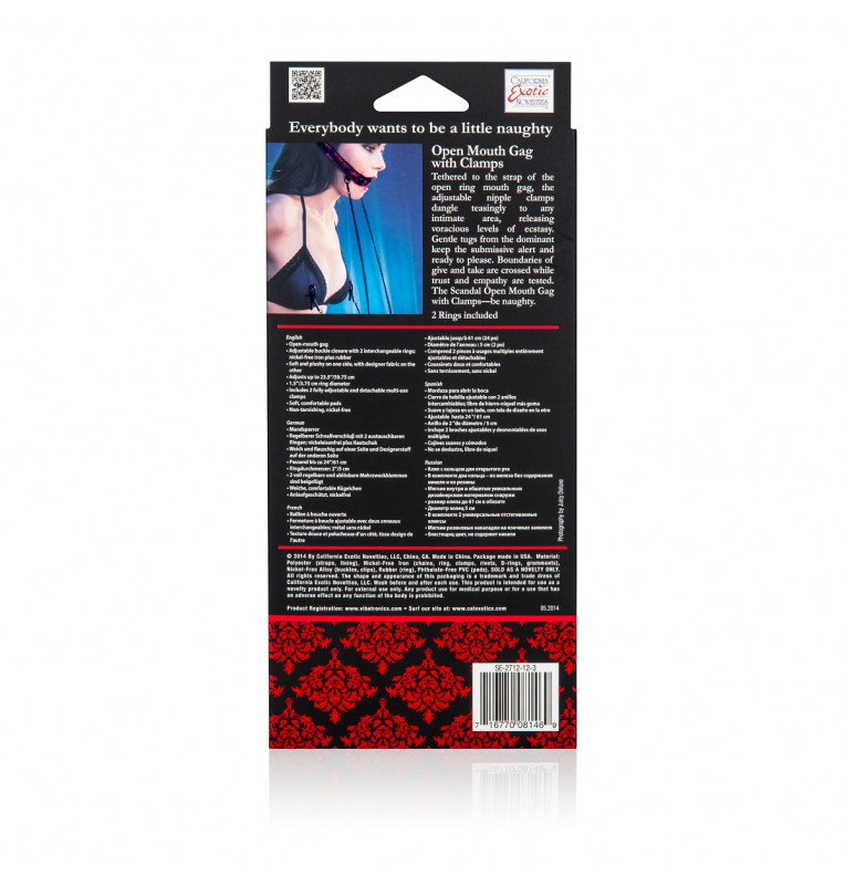 Кляп-рамка Scandal Open Mouth Gag with Clamps с зажимами на соски - изысканная жесткость. Регулируемая пряжка - дизайнерская ткань с чувственной росписью на внешней стороне, мягкая и плюшевая внутри. Регулируемые зажимы на цепях с резиновыми прокладками для удовольствия сосков. Эстетика и красота в каждой детали. Комфорт и безопасность во время игры. Длина каждого зажима - 5,75 см. Диаметр зажимов - 3,25 см. Длина каждой цепи - 56 см. Пряжка регулируется до 59 см.