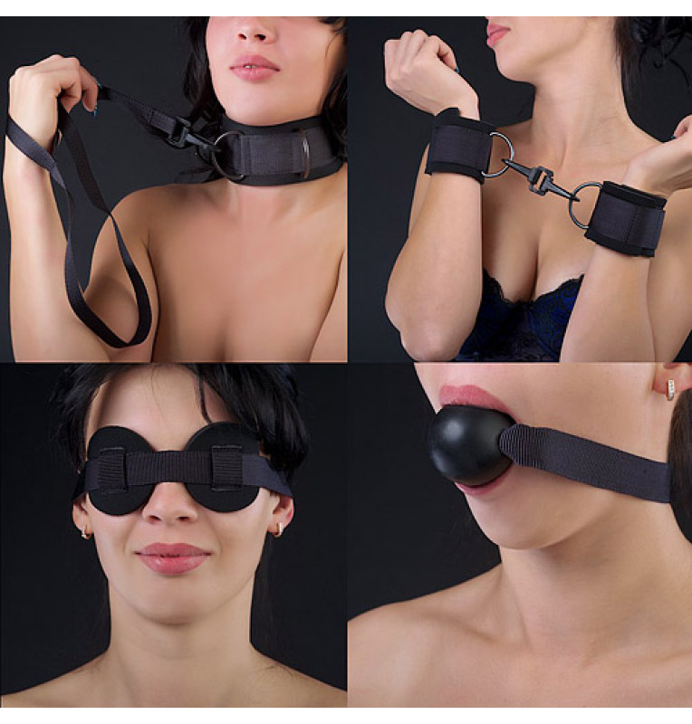 Чёрный комплект для БДСМ-игр: наручники, кляп-шарик, маска, ошейник