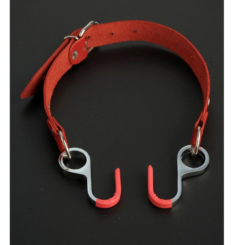 Кляп, который состоит из двух прорезиненных крючков на красном ремешке, способных широко растянуть рот партнеру для воплощения самых сокровенных фантазий. Ремешки удобно и легко регулируются под любой размер головы. Изготовлен из натуральной кожи и никелированной фурнитуры. Размер универсальный.