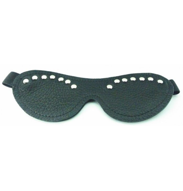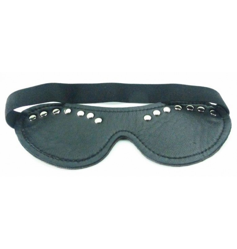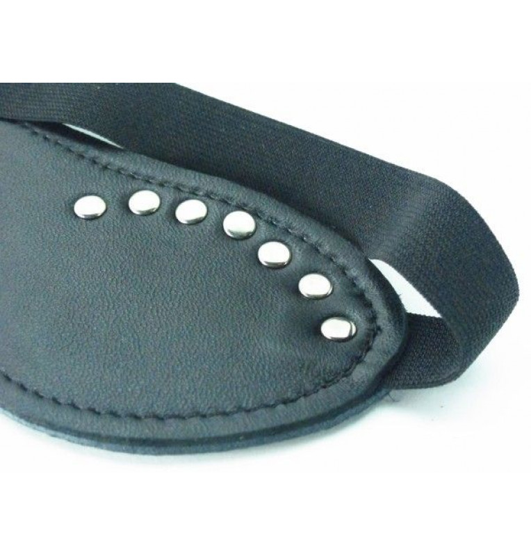 Черная маска из кожзама, декорированная заклепками. Крепится к голове при помощи удобной резинки. Ширина - 7 см.